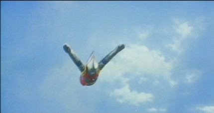- Ah ah, Jet Jaguar s’est échappé. Eh ! Mais c’est quoi ça, Megalon se met à voler en rond autour du robot. Jet Jaguar tourne sur lui-même pour essayer de suivre...