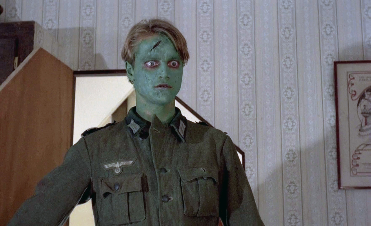 Dans le même style, Rollin ne disposant que de huit uniformes (à ne pas regarder de trop près) et un camion pour refaire la Seconde Guerre Mondiale, utilise des stocks-shots d’un film de guerre pour étoffer ses scènes de flash-back censées nous expliquer l’origine des zombies nazis. Manque de bol, toutes ces scènes volées sont sous la neige, alors qu’il a tourné les siennes en été par grand beau temps ! De même je recommande le moment où les Nazis sont attaqués par un avion qui se résume à un bruit de moteur. Les Allemands font alors semblant de tirer en l’air en courant dans tous sens et en prenant des airs affolés. Effarant !