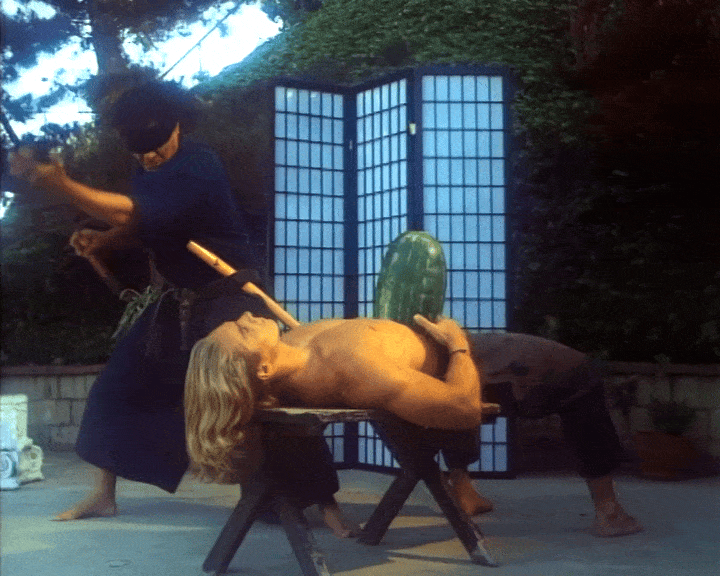 Autre avantage de la pastèque : elle est parfaitement comestible, et peut donc être dégustée à l’issue de l’entraînement. Dans l’ineffable et délicat Ninja Terminator (1985), il y a une scène où Richard Harrison s’entraîne en trucidant une pastèque au katana dans son dojo ultra secret sa salle à manger. Un peu plus loin dans le film, on voit un autre protagoniste ninja déguster chez lui une pastèque. Hasard ? C’est peu probable : nulle doute qu’il s’agit des tranches du même fruit, qui aura donc servi pour deux scènes distinctes.