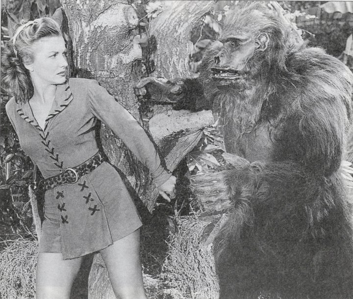 Et puisqu'on parle de singes, il nous faut aussi évoquer le cas particulier de Ray Corrigan puis Steve Calvert, acteurs spécialisés dans les rôles de primates. Après avoir enchaîné les petits boulots comme figurant ou cascadeur, Ray "Crash" Corrigan eut un jour l'idée un peu insolite, au début des années 1930, de se faire confectionner deux costumes de gorille. Misant sur la qualité du travail (la fourrure est en vrais cheveux, comme les perruques à l'époque), Ray "Crash" Corrigan s'était ainsi trouvé en possession de costumes de si bonne facture qu'ils surclassaient sans peine la plupart des costumes de grands singes miteux vus jusqu'alors. L'investissement s'était avéré payant : en une petite vingtaine d'années, Corrigan aura fait le singe dans une foultitude de productions, prenant grand soin de son outil de travail, qu'il perfectionne à l'occasion. Le masque de gorille très figé qu'il utilise dans des films comme Tarzan l'homme singe (1934), Darkest Africa (1936) ou The Ape (1940) sera ainsi remplacé par une version plus détaillée, avec notamment une mâchoire amovible et des narines qui se dilatent, à l'oeuvre par exemple dans Nabonga (1944), La belle et la brute alias The Hairy Ape (1944) ou White Pongo (1945). En 1948, après une carrière aussi poilue que bien remplie, Corrigan consent à passer le relais et revend ses deux costumes de gorille, dont l'un que Steve Calvert acquiert pour la coquette somme de 1800 dollars et qu'il enfilera à son tour dans plusieurs films, comme l'ubuesque Le Gorille de Brooklyn alias Bela Lugosi Meets a Brooklyn Gorilla (1952), Untamed Mistress (1956) ou le gentiment perché La Fiancée de la jungle (1958), scénarisé par Ed Wood.
