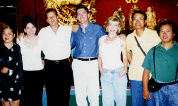 Godfrey Ho, deuxième en partant de la droite, en compagnie de Loren Avedon et Cynthia Rothrock sur le tournage de « Manhattan Chase » (2000)